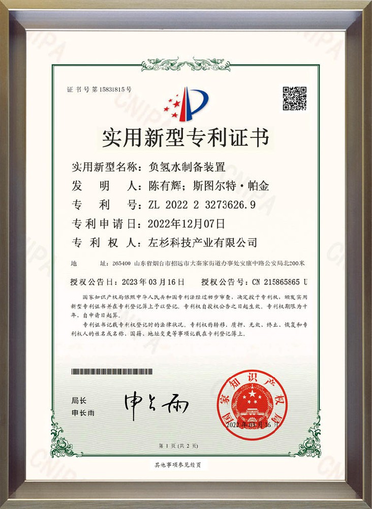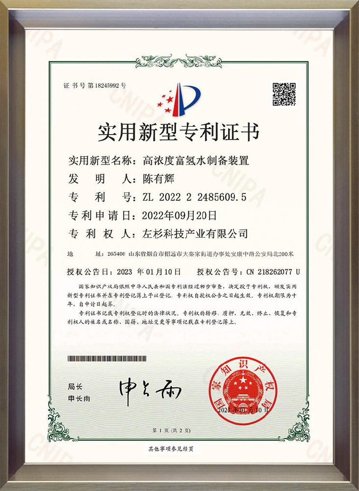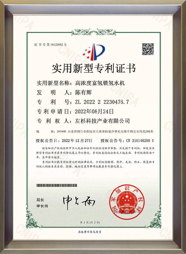普通富氢水氢分子只能融入到水分子团的缝隙中,所以氢含量低,左杉产业通过独有专利技术将水分子团变成单体的水分子,氢分子均匀的融入水分子之间,大幅提高了富氢水的氢含量,已获多项国家专利